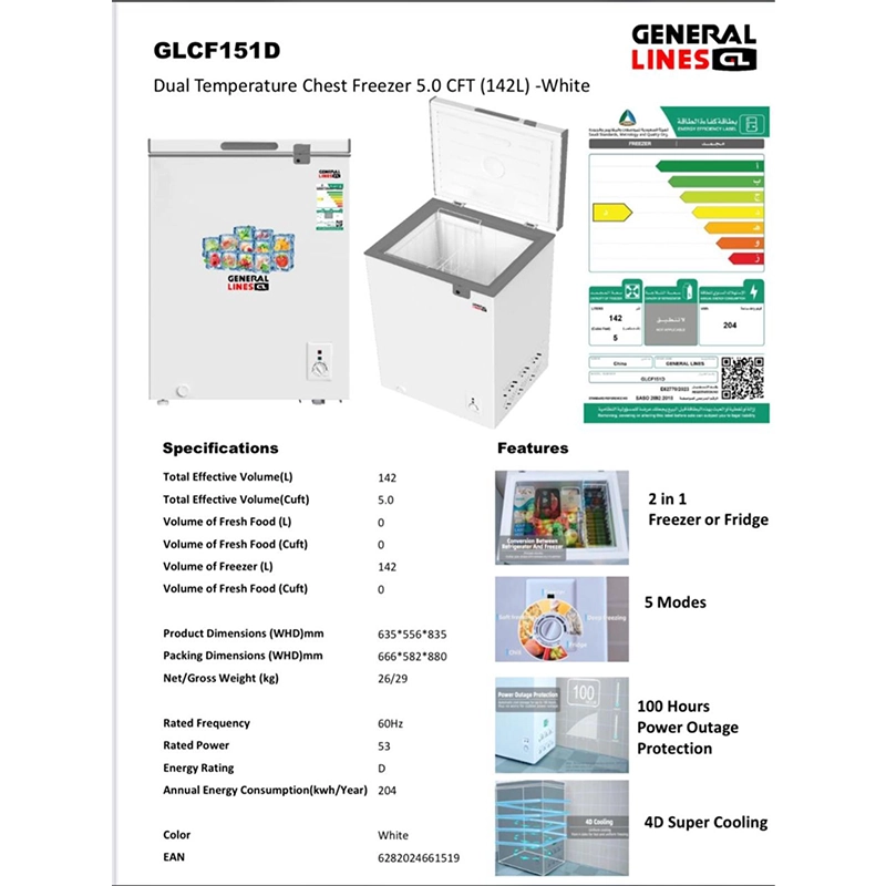جنرال لاينز فريزر و ثلاجة 2 في 1 ، 5 مستويات للتجميد و التبريد ، تبريد رباعي الإتجاهات 142 لتر – 5.1 قدم ابيض GLCF151D