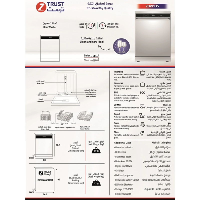 غسالة صحون Z.Trust بسعة 12 طقم مع 7 برامج مختلفة وشاشة ديجيتال لسهولة التحكم، تصميم ستيل أنيق وتنظيف قوي وفعّال.