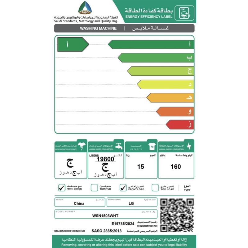 سعة الغسيل: 15 كغ