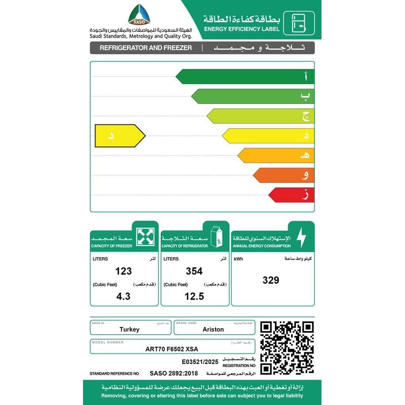 استمتع بتبريد متطور وأداء ذكي مع ثلاجة أريستون ART70F6502XSA ❄️✨