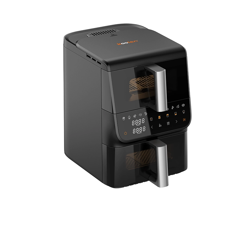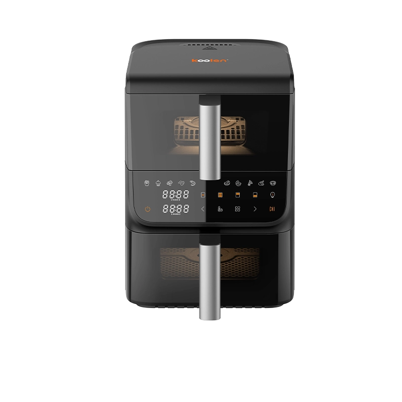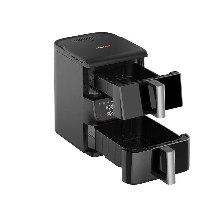 تتميز القلاية بتصميم عمودي مبتكر يوفر حتى 30% من المساحة، مع سلتين مستقلتين (علوية وسفلية) لتتمكن من طهي أكثر من نوع من الطعام في نفس الوقت. كما توفر تقنية Rapid Air Circulation لطهي متساوٍ ومقرمش بدون زيت أو بكمية قليلة جدًا.