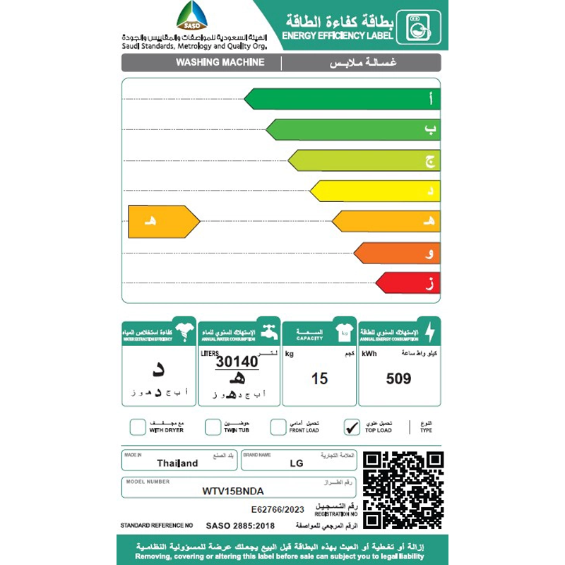 LG top automatic washing machine, 15 kg, black, WTV15BNDA