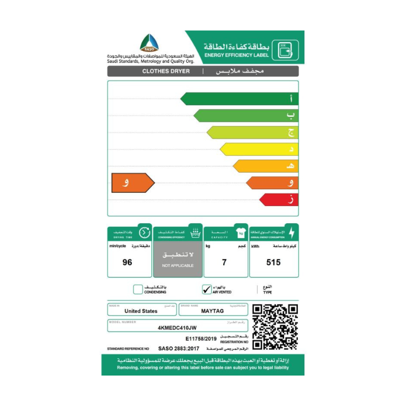 The Maytag condenser dryer features a stainless steel drum that is resistant to cracks and scratches caused by metal zippers, buttons, and studs. Using a large-capacity clothes dryer can help save energy when drying laundry; all you need to do is fill the dryer according to the program capacity each time. 7 kg capacity dryers tend to be more suitable for large families with a greater amount of laundry that needs to be dried.