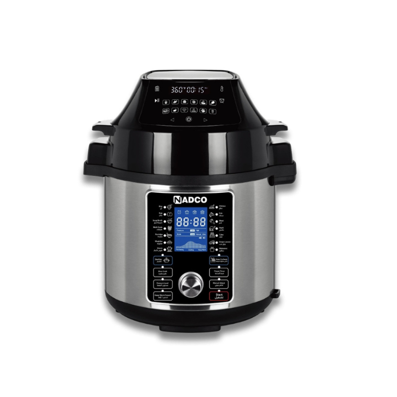 Experience next-level cooking with the NADCO Multi-Pressure Cooker, combining 5 powerful functions: pressure cooking, air frying, boiling, reheating, and regular cooking – all in a sleek 6-liter appliance.