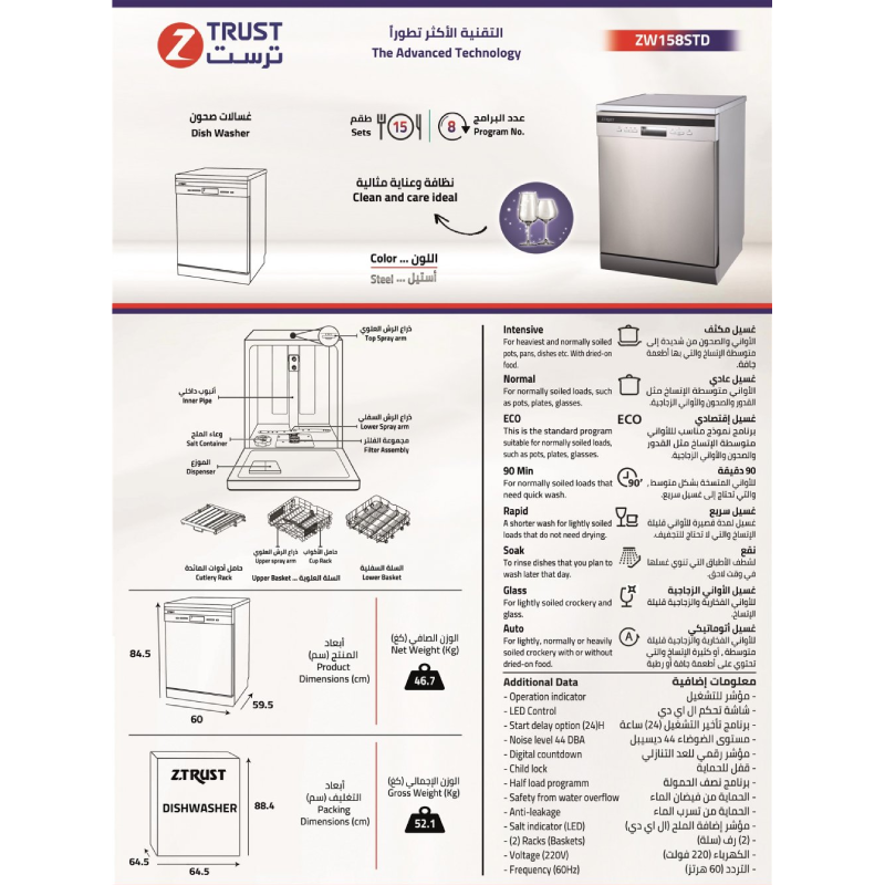 ز.ترست غسالة صحون ، 7برامج ، شاشة عرض ، 15طقم ـ أستيل-ZDW15S