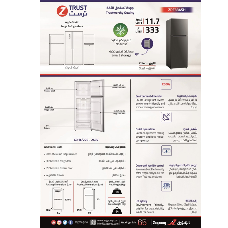 ز.ترست ثلاجة 11.7 قدم3، 333 لتر – أستيل -ZRF334SH