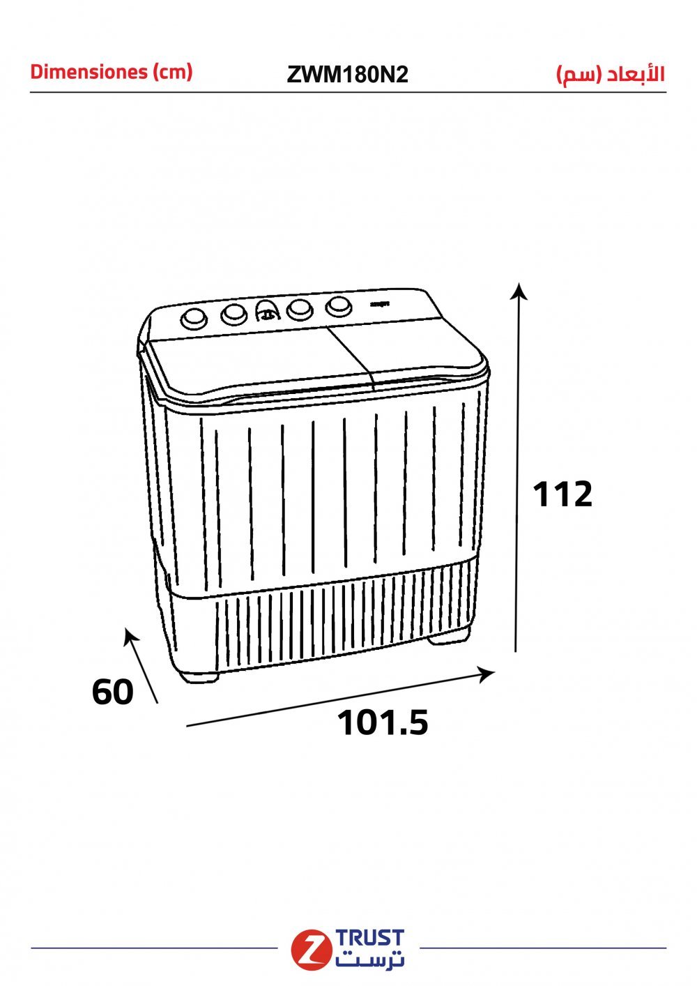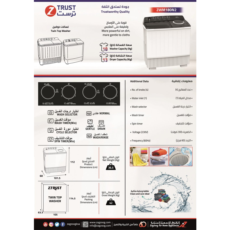 زي تراست غسالة ملابس حوضين 18 كيلوغسيل – 16 كيلو تجفيف – ZWM180N2